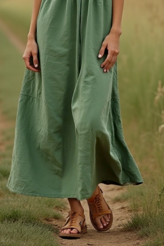 Bohemian Dress Green V Neck Ruched Maxi Dress