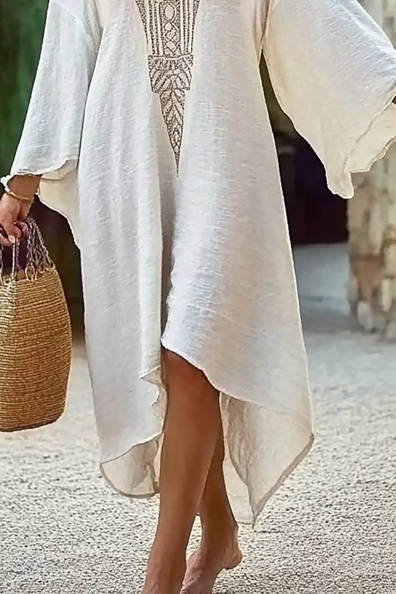 Bohemian Loose Dress Ivory V-Neck Linen Midi Dress
