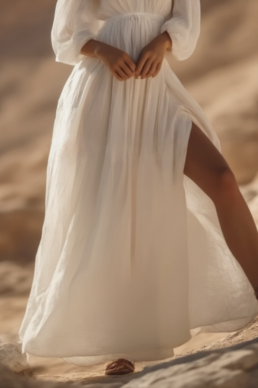 Embrace ethereal boho charm in this flowing White V-Neck Swing Dress, featuring a romantic floor-length silhouette with a sensual thigh-high slit. The airy fabric creates graceful movement, while the plunging neckline adds modern allure. Perfect for beach weddings or summer festivals, this dress radiates carefree elegance with every step.