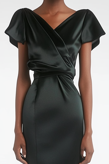 This elegant black satin midi dress features a flattering V-neck and chic ruffle details, making it perfect for formal parties or work events. Its timeless design offers a sophisticated, yet stylish look for any occasion.