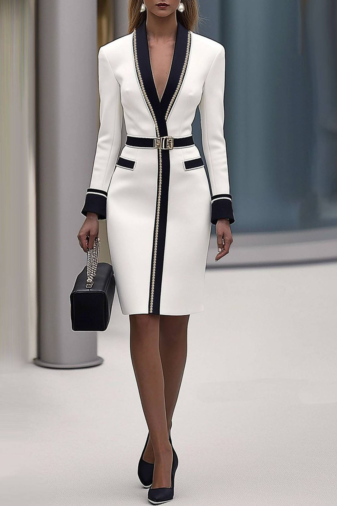 This white work dress combines a flattering V-neckline with subtle pearl detailing for a sophisticated office look. The belted waist creates a defined silhouette, while the knee-length cut ensures a professional and elegant appearance. Ideal for office settings, business events, and corporate meetings, this dress balances style and comfort for all-day wear. Pair with heels or a blazer for a polished, refined outfit.